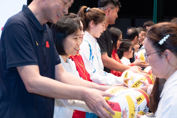 活动现场举行“冠军赠礼”环节,各位领导和体育冠军向学生代表赠送签名排球并合影留念。